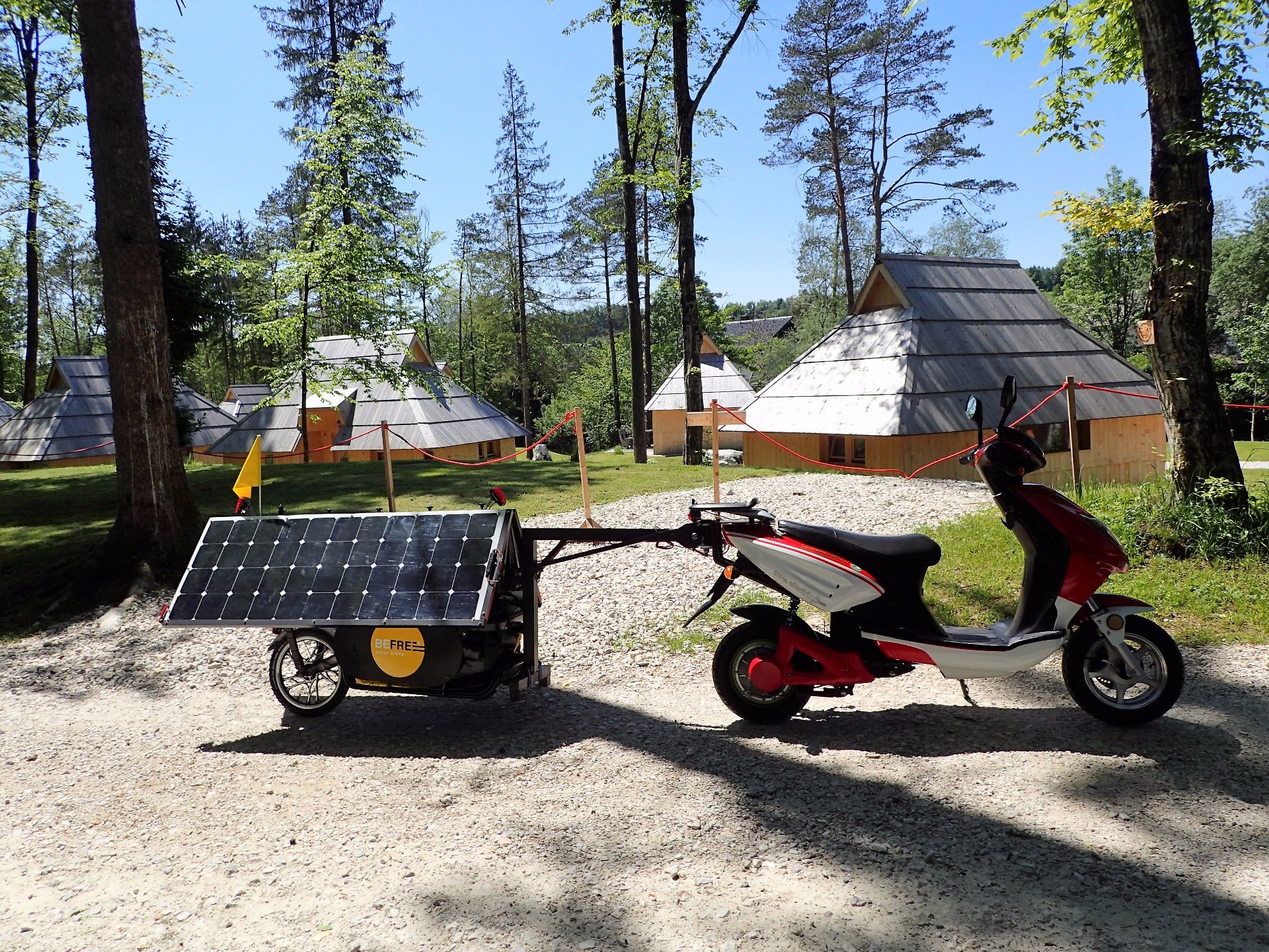 Due to the highly rigid clamping of solar trailer on the bike (under the driver's seat) one does not feel torsion; the load on bike is half the load to the trailer. Even at high speed (60 km per hour) downhill a biker does not feel torsional load, the trailer extremely well follows to attached bicycle or scooter. After many researches and many years of experience the flexible solar panels have the most favourable position. From sunrise to sunset they have the best efficiency. This position can be further improved with the aid of actuators, four-way switch and remote control. Solar panels have good efficiency also at riding, as the position enables the continuous heat dissipation. At high external temperatures and poor cooling of panels the power of panels can drop by 35%.